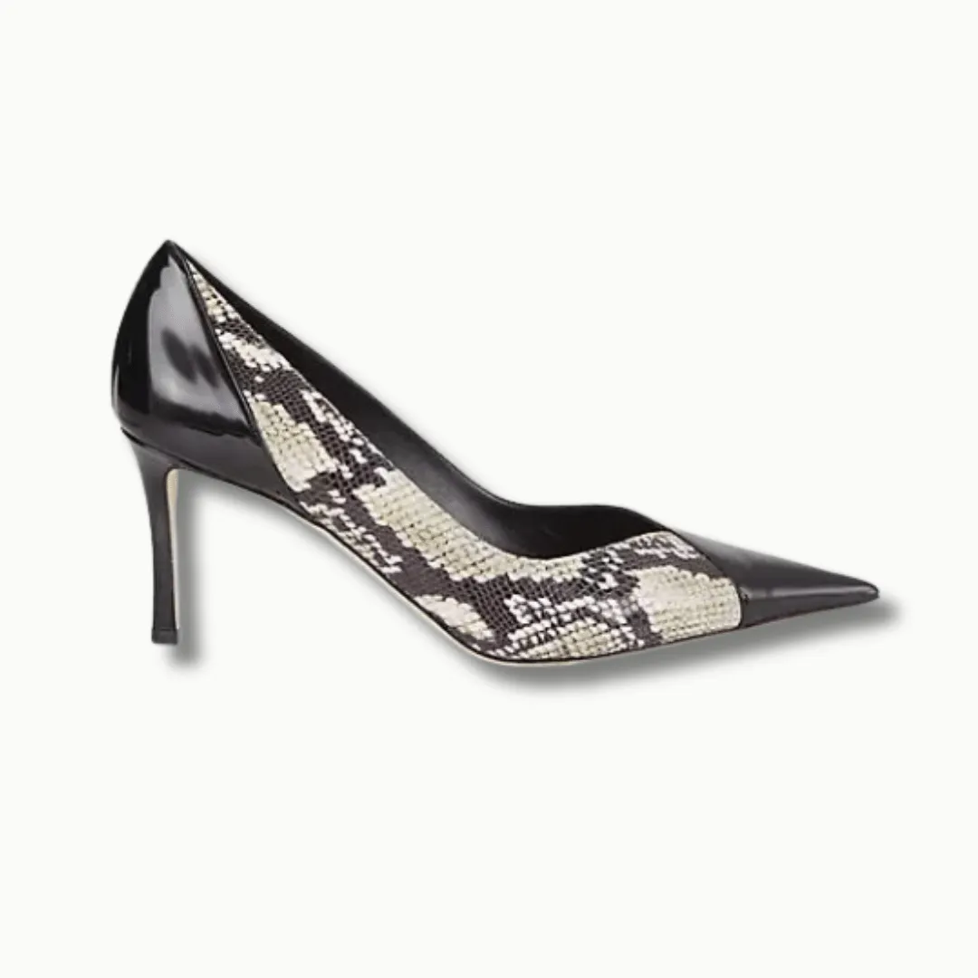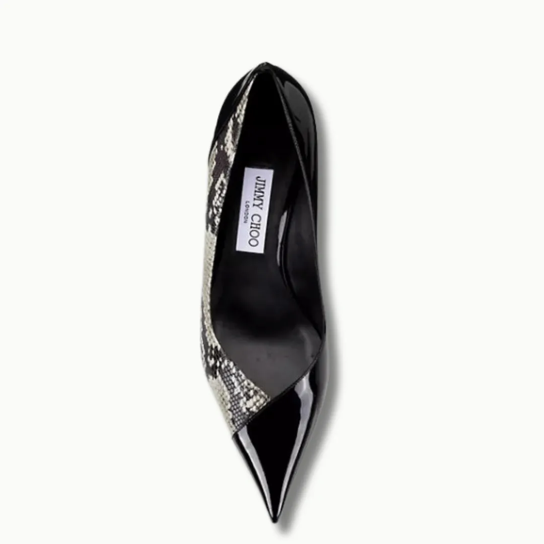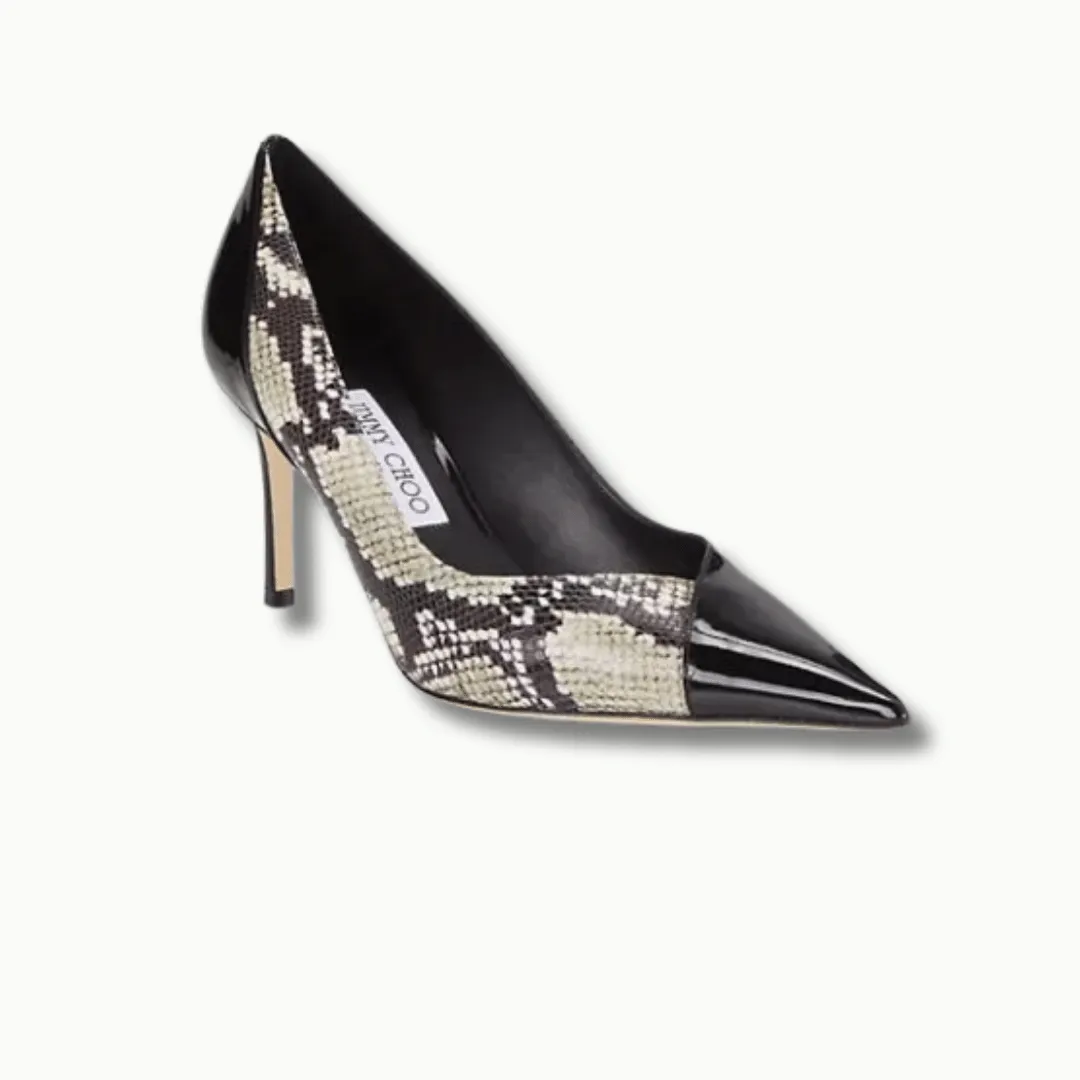 Jimmy Choo’s Cass pumps are crafted of shiny patent leather with a snake-printed accent.