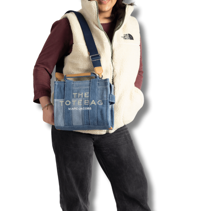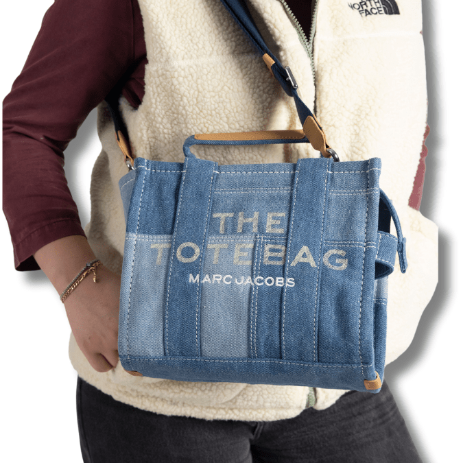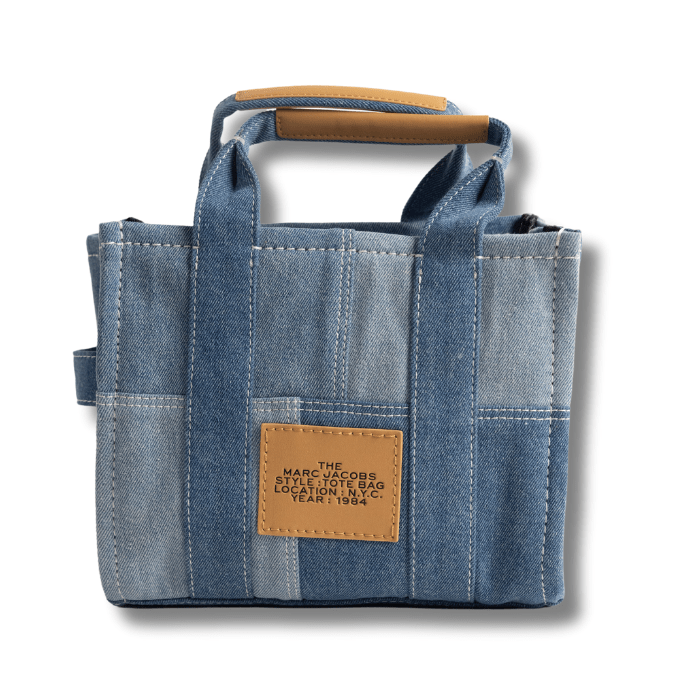 Patchwork cotton denim bag Color: blue Beige leather inserts Front print Inner pockets Removable adjustable shoulder strap Zip fastening