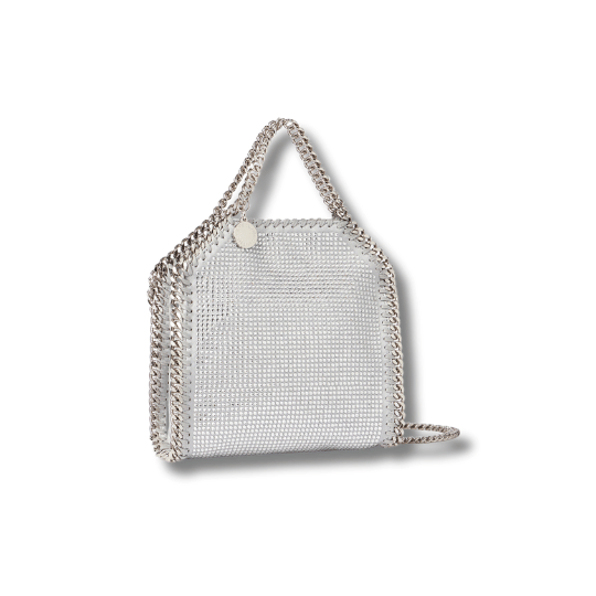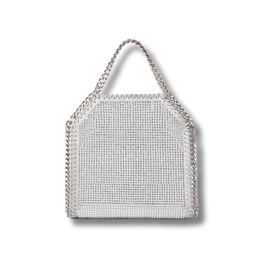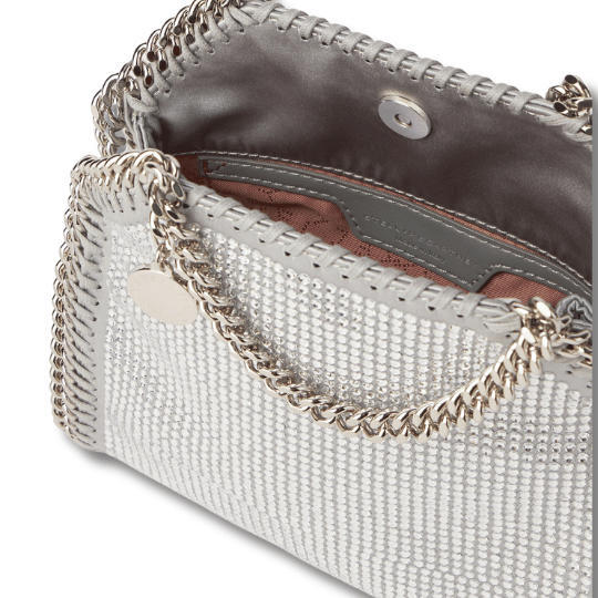 iconic Falabella tote bag has been given a vintage-inspired refresh for Autumn 2023 with all-over lead-free crystals on a satin backing. Hand-laced with organic cotton, the tiny tote has a striking diamond-cut chain that glints in light and is fully lined with recycled materials.