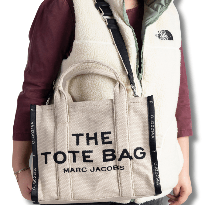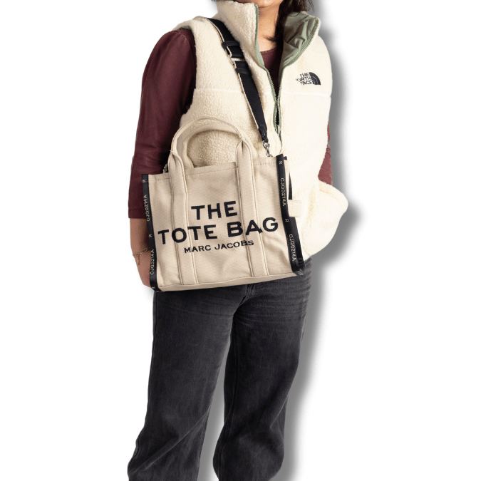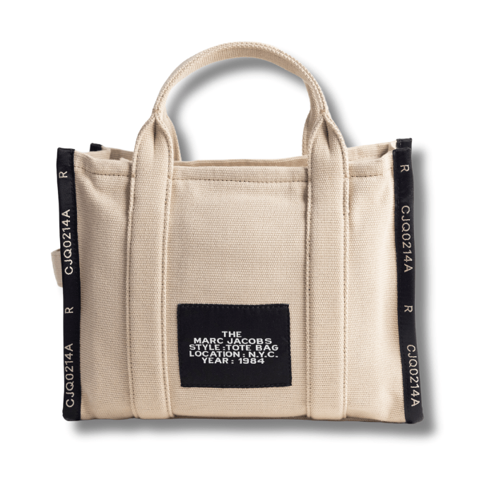 Beige/black cotton-blend medium The Jacquard Tote bag from Marc Jacobs featuring jacquard logo motif, logo-tape detailing, logo patch to the rear, top zip fastening, adjustable detachable shoulder strap, two top handles and main compartment.